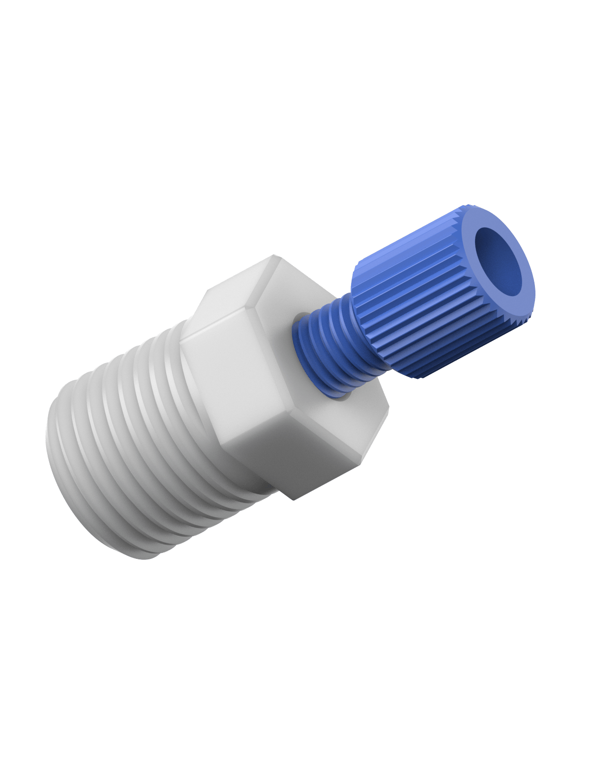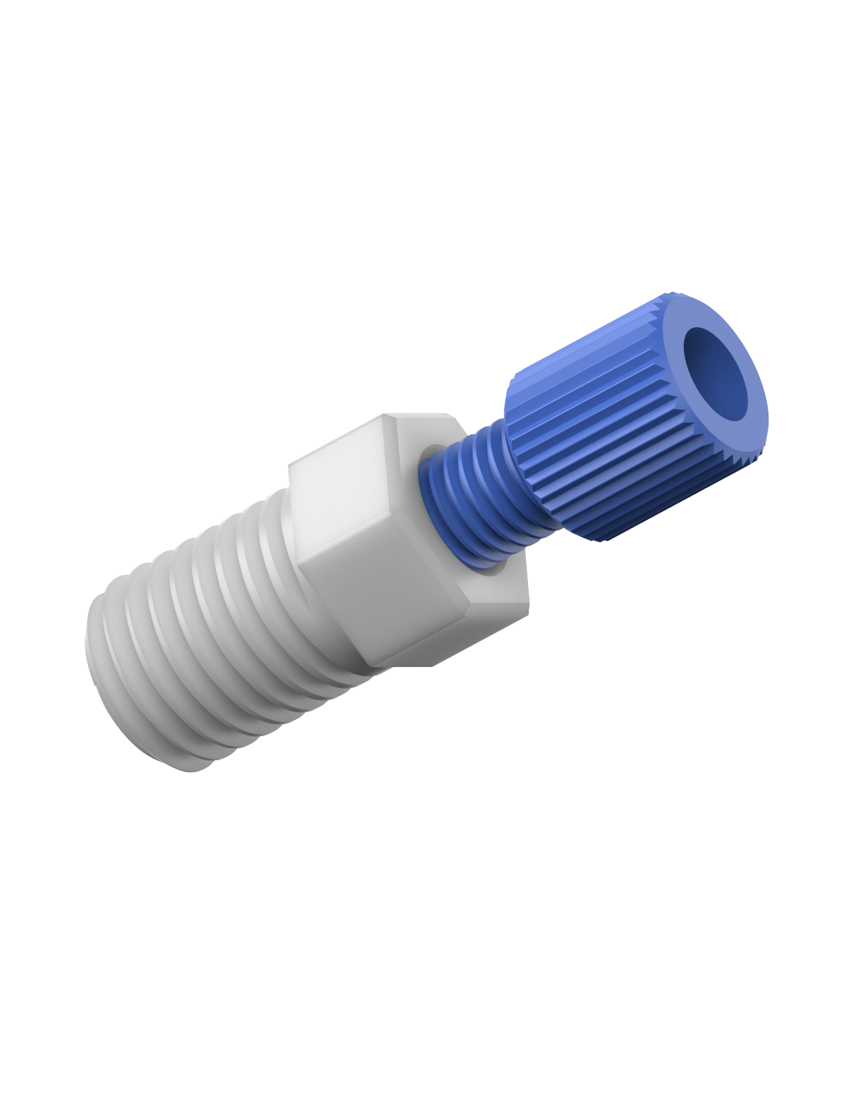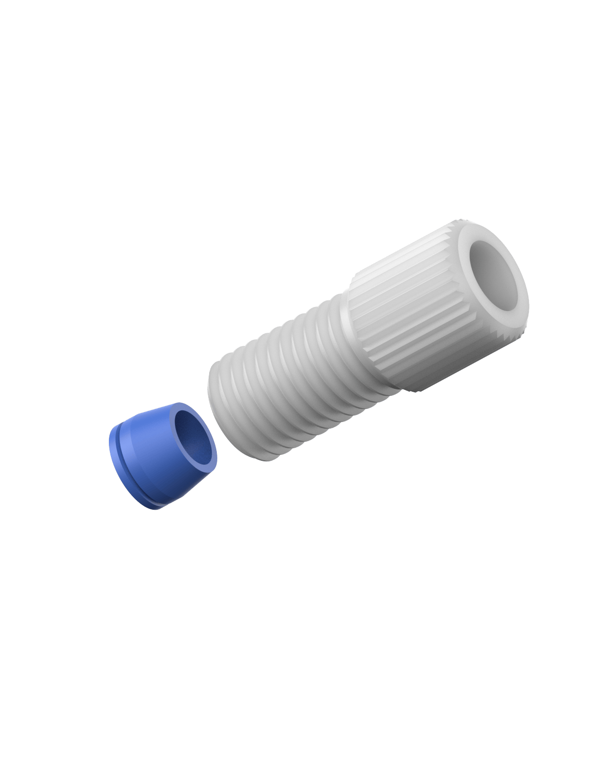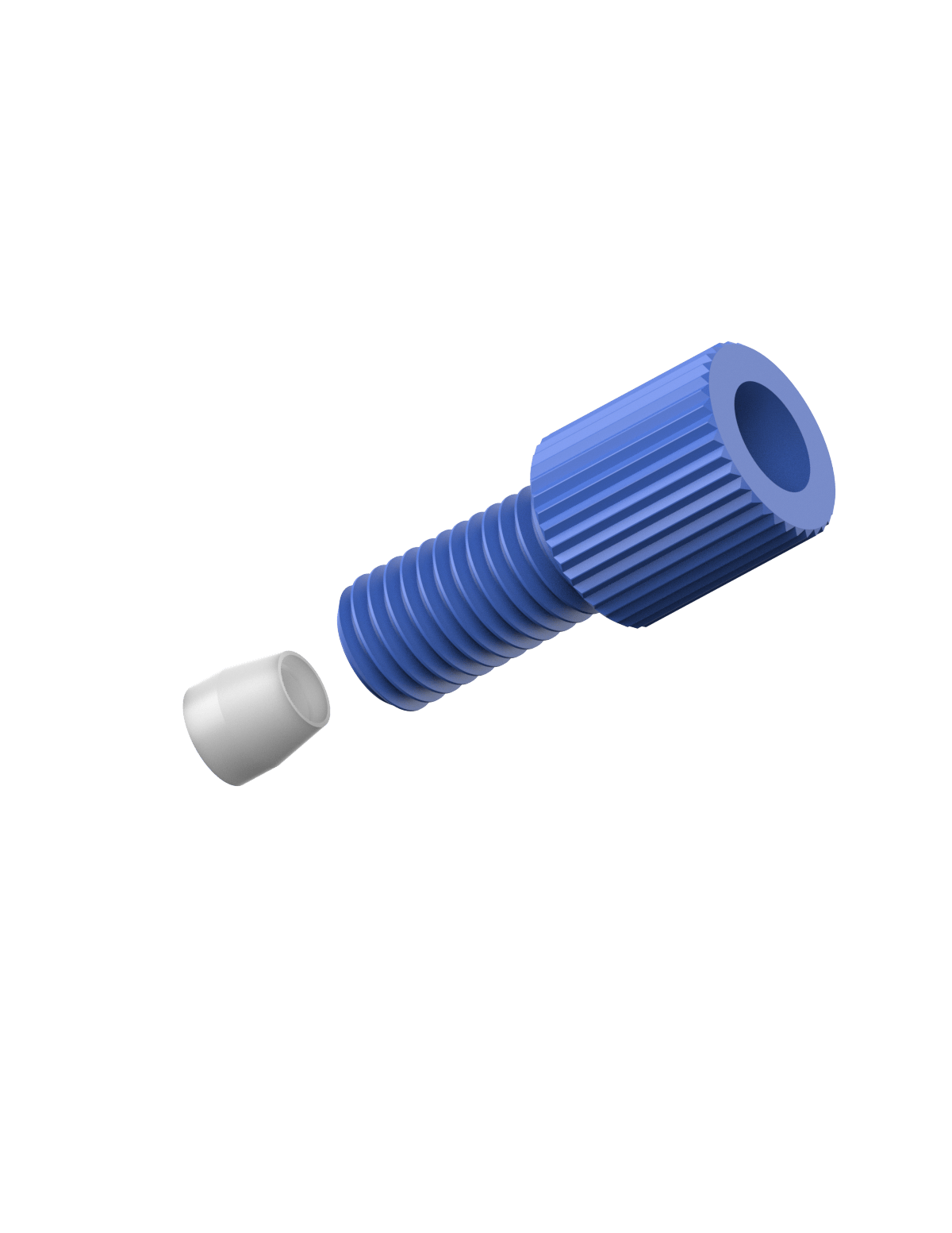 The small diameter tubing (typically less than 1/4” OD), commonly used in laboratory instruments for transporting solvents, is often made from fluoropolymers like PTFE, PFA, or FEP. Due to their rigid walls, these chemically resistant tubes are not suitable for barbed connectors. Instead, they are attached to caps and manifolds using compression fittings. These fittings work by tightening a threaded nut over a pliable ferrule, compressing the tubing’s outer diameter to create a secure, leak-proof seal around the tube and at the bottom of the threaded port.
