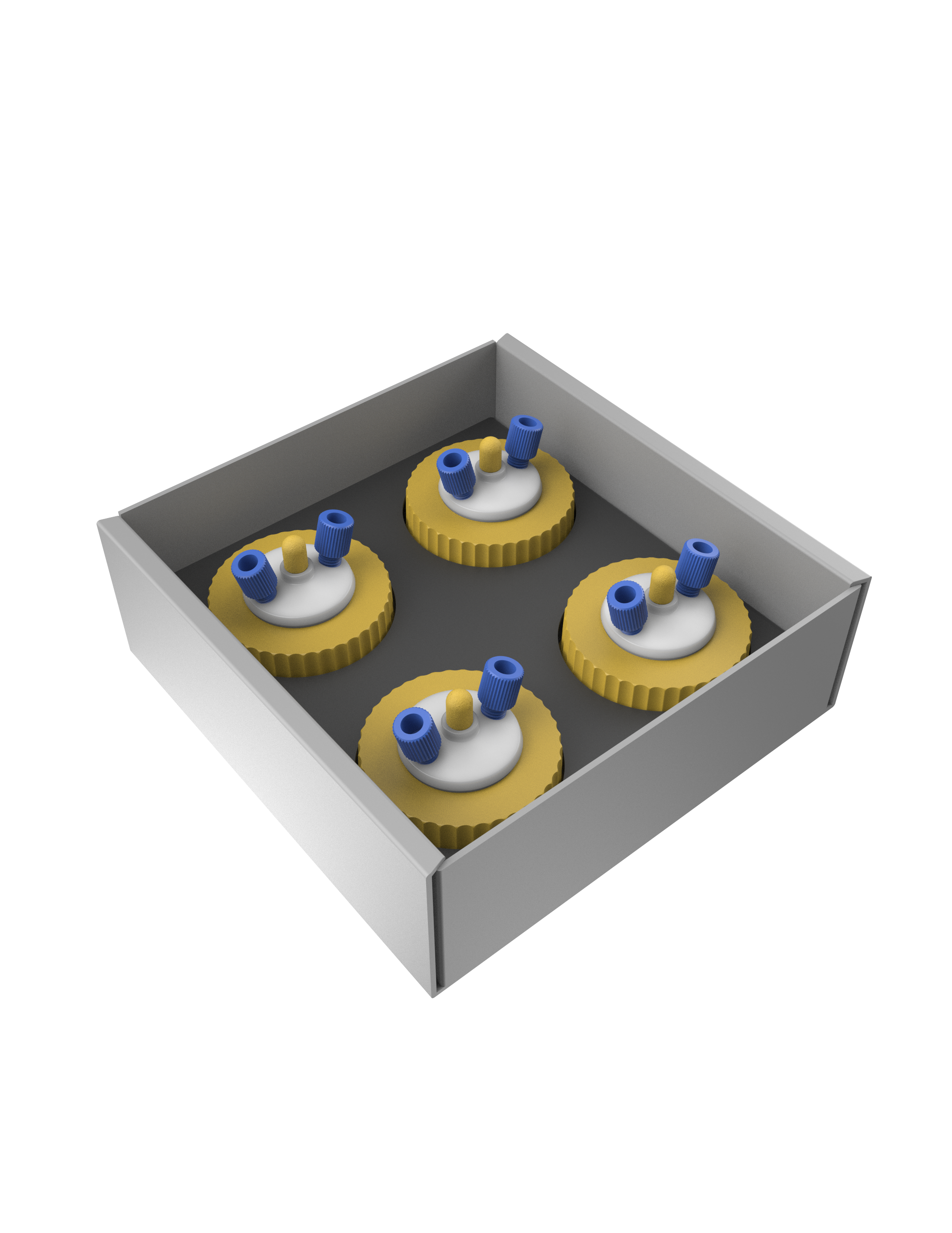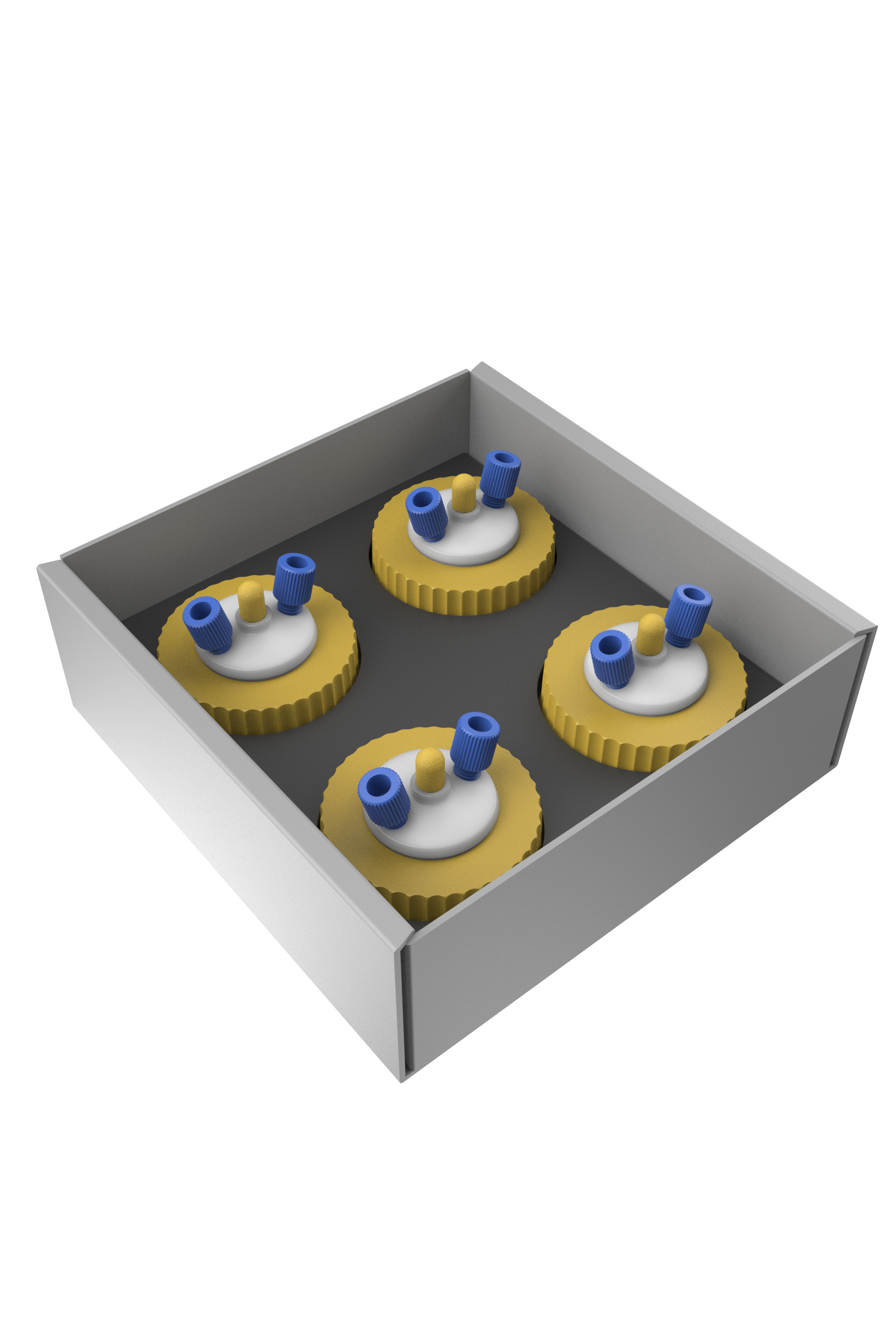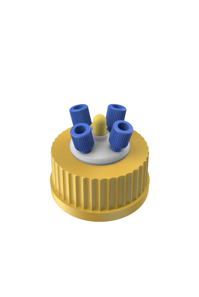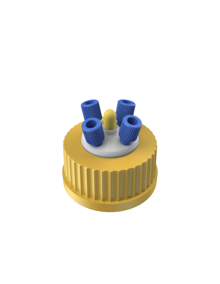 All Lab Lids safety caps for solvent extraction include ported inserts—threaded ports designed for secure tubing connections.