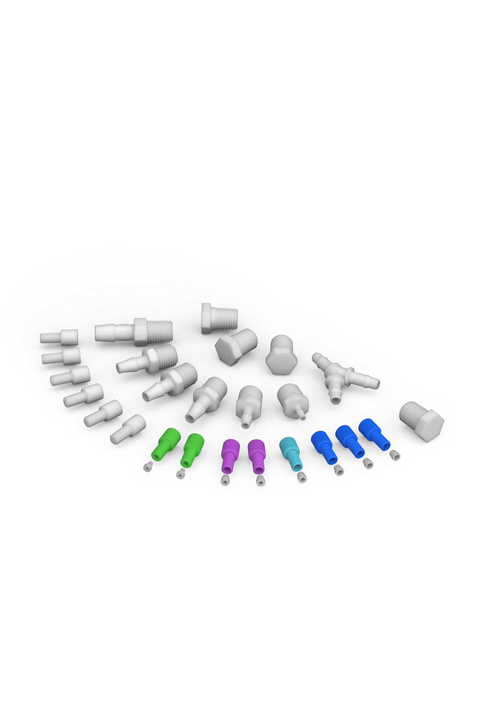 Fittings kits, tubing extensions, thread adapters, and plugs